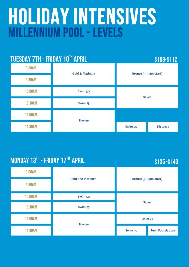 Lessons range from 30 – 60 minutes depending on individual level and are held 3 – 5 days a week in New Zealand’s premier swimming facilities (subject to events and public holidays).